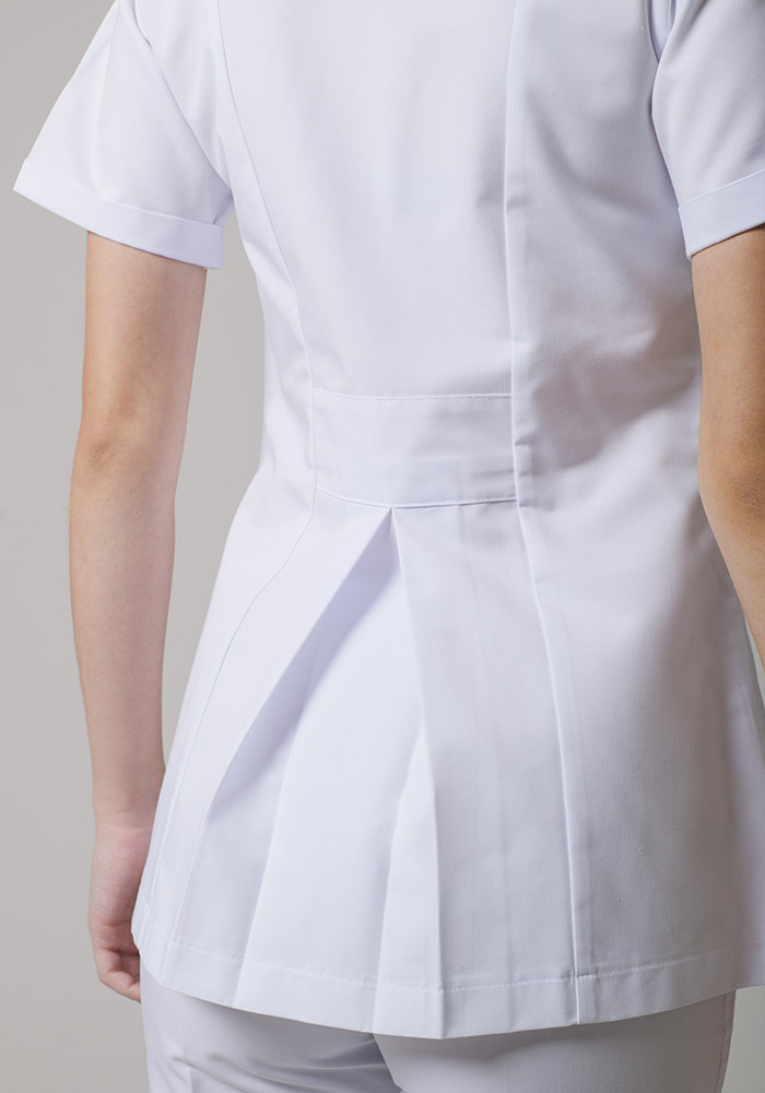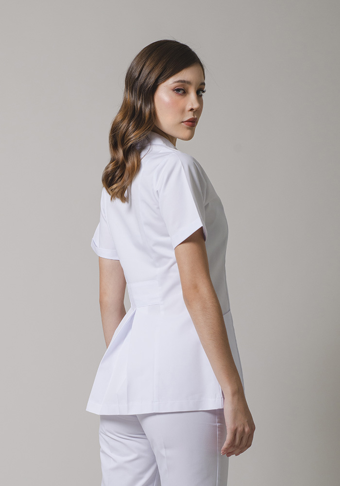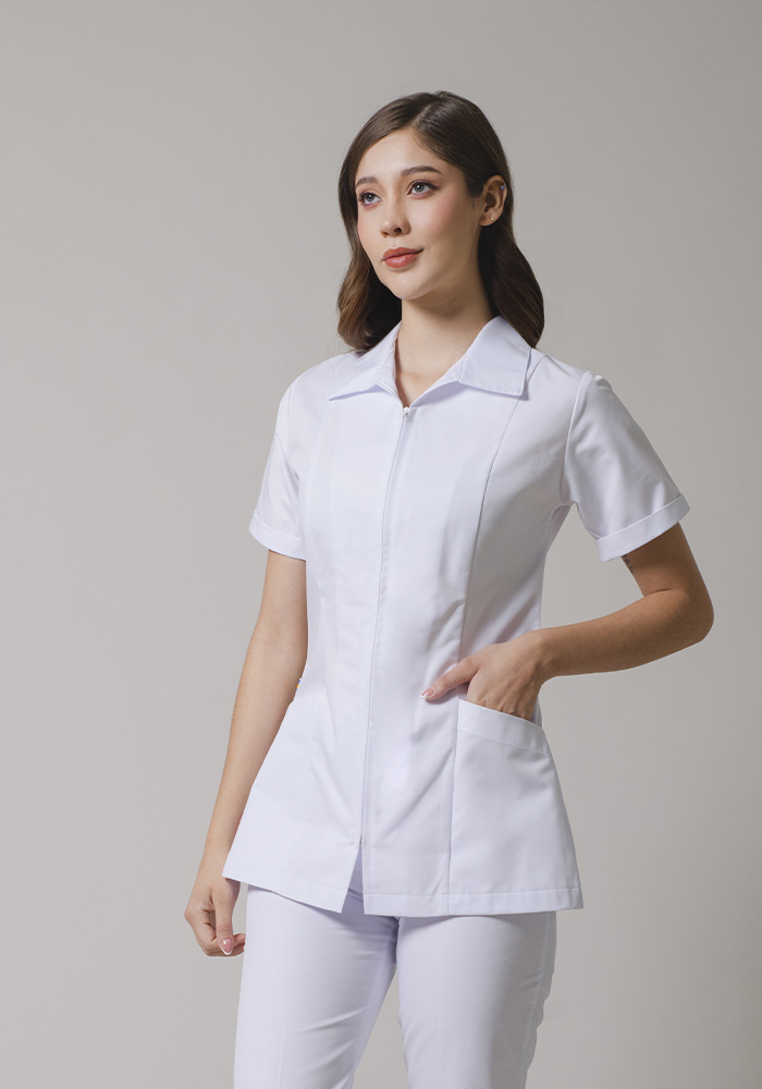 Filipina manga corta con cierre al frente, 2 bolsas inferiores ocultas, espalda con patol.